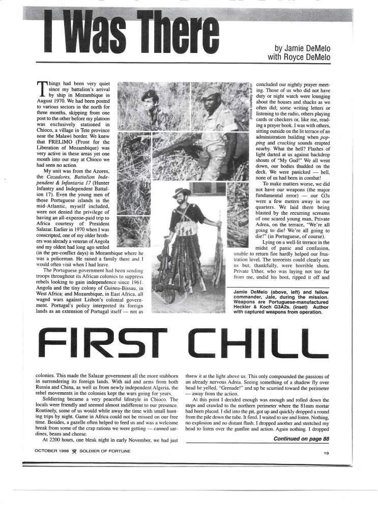 Below is a scanned copy of an old amusing article I wrote for Soldier of Fortune’s magazine’s ‘I Was There’ page called ‘First Chill’ about my uncle’s first experience in combat in Mozambique during the Colonial War.